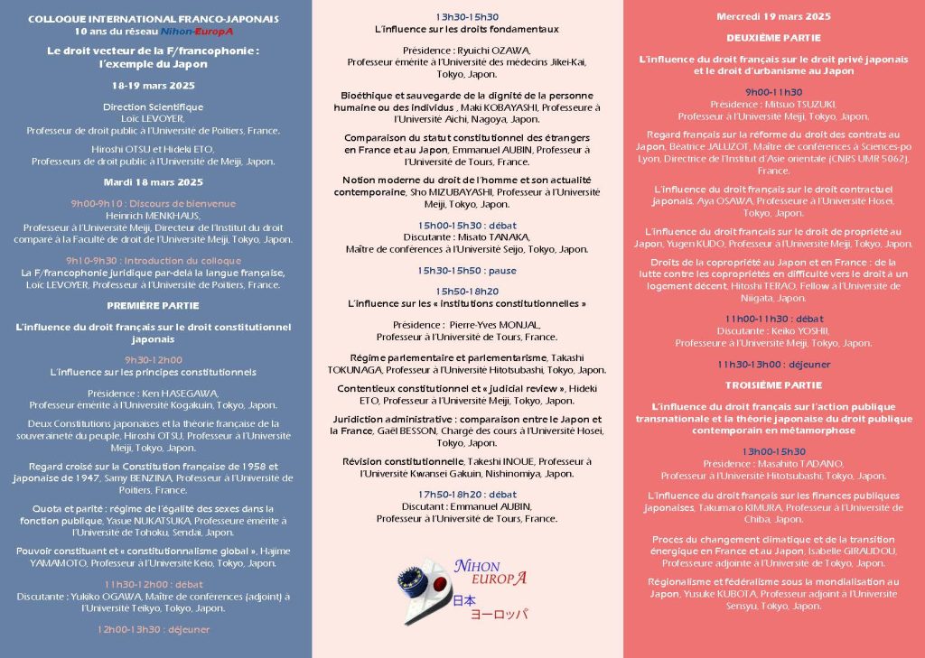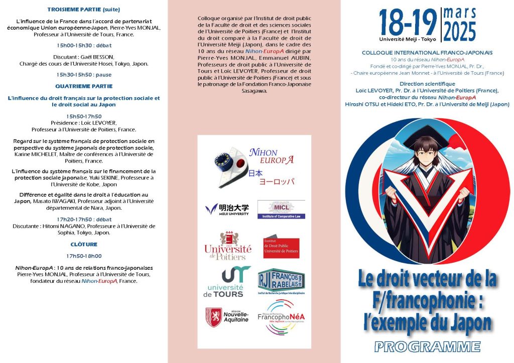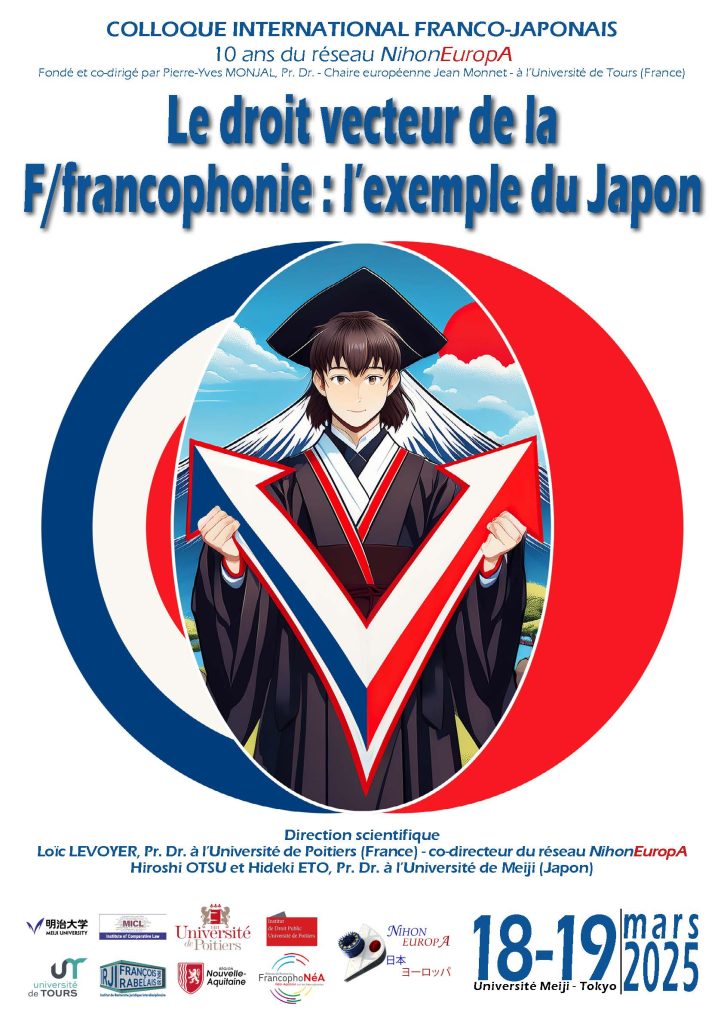 Placé sous la direction scientifique du Prof. Dr. Loïc LEVOYER, de l’Institut de droit public de l’Université de Poitiers (France) et des Prof. Dr. Hiroshi OTSU et Hideki ETO de l’Institut du droit comparé de l’Université de Meiji (Japon), le colloque consacrant les 10 ans du réseau Nihon-Europa (https://www.nihoneuropa.fr/) abordera successivement l’influence du droit français sur le droit constitutionnel japonais, l’influence du droit français sur le droit privé japonais, l’influence du droit français sur le droit public japonais et l’influence du droit français sur la protection sociale et le droit social au Japon.