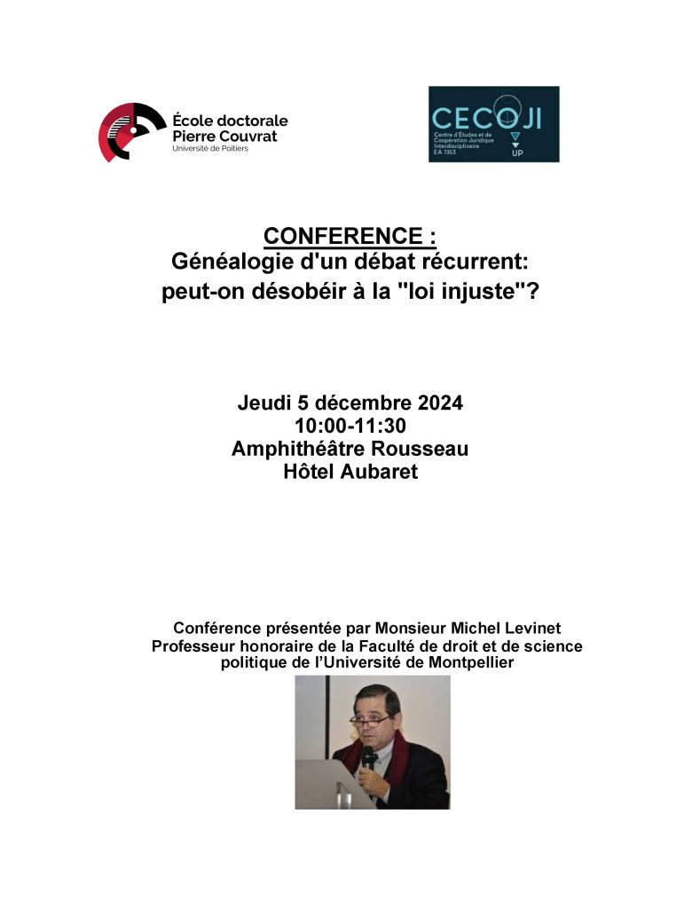 La conférence comportera deux temps. Assez bref, le premier temps permettra de rappeler la typologie classique des actes de résistance : objection de conscience, désobéissance civile, résistance utilisant le recours à la violence (tyrannicide, rébellion, révolution) ainsi que la récurrence dans l’histoire des actes de désobéissance. Bien plus substantiel, le second temps abordera une autre récurrence : celle de la théorisation problématique de la désobéissance à la loi injuste. Seront analysées les approches : du christianisme, du Reditte, issu du dialogue entre Jésus et les Pharisiens à Jean-Paul II, en passant par Paul de Tarse, Augustin d’Hippone, Thomas d’Aquin, la pensée politique protestante post Saint Barthélemy (De Bèze, Hotman, Jurieu, Althusius) et Bossuet ; des philosophes des XVIIème et XVIIIème siècles (Pufendorf, Hobbes, Locke, Rousseau, Barbeyrac, Burlamaqui, Condorcet, Kant) ; des théoriciens du libéralisme politique du XIXème siècle (Benjamin Constant, Tocqueville, Stuart Mill) ; des théoriciens de la résistance à l’oppression au XXème siècle (Tolstoï, Gandhi, Arendt, Rawls, Dworkin, Todorov, Balibar).