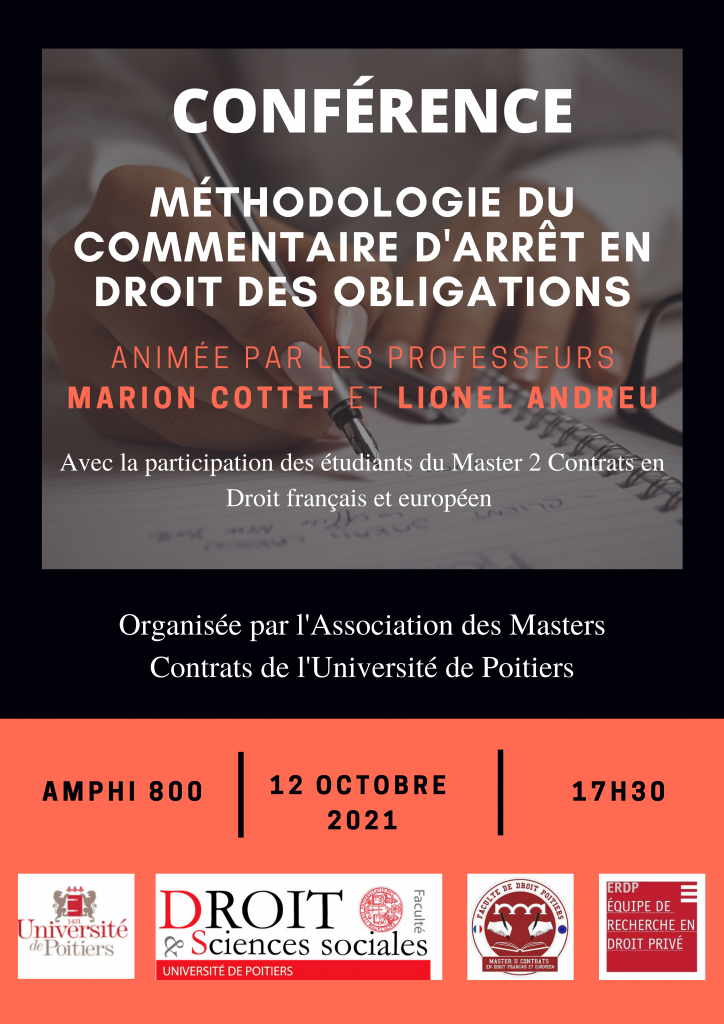 L'association des masters Contrats de l'Université de Poitiers et les étudiants du Master 2 Contrats en droit français et européen organisent mardi 12 octobre 2021 de 17h30 à 19h30 une conférence intitulée « Méthodologie du Commentaire d'arrêt en droit des obligations ».