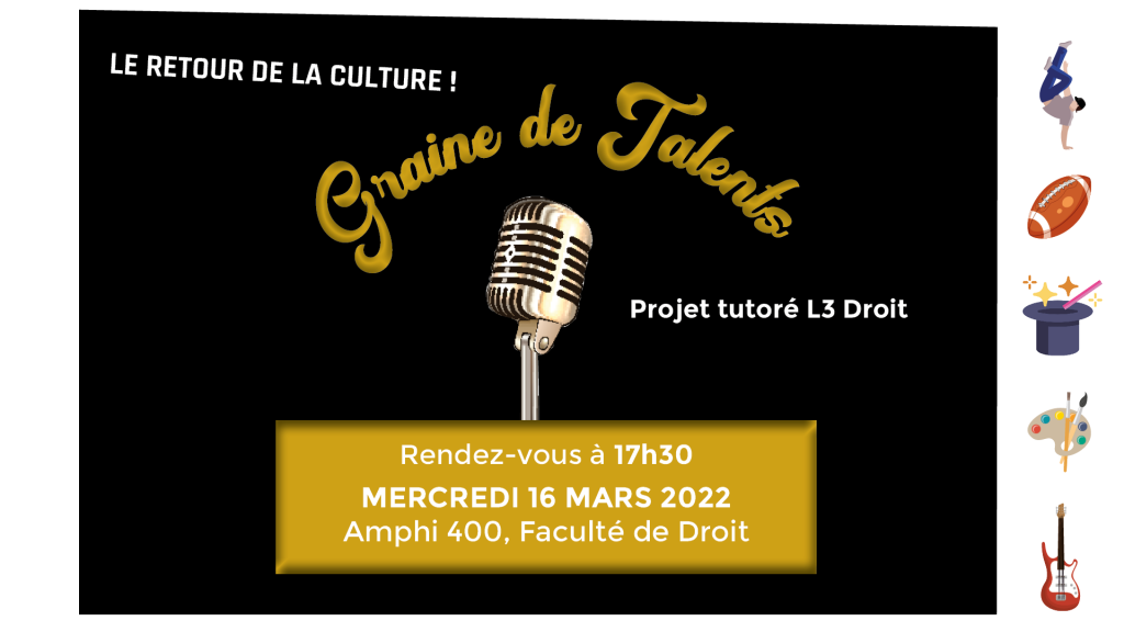 « Graine de Talents » est le fruit d’un projet tutoré organisé par trois étudiants de L3 (carrière judiciaire), accompagnés par leur professeur référent Monsieur Adrien LAUBA et soutenu par Grand Poitiers.