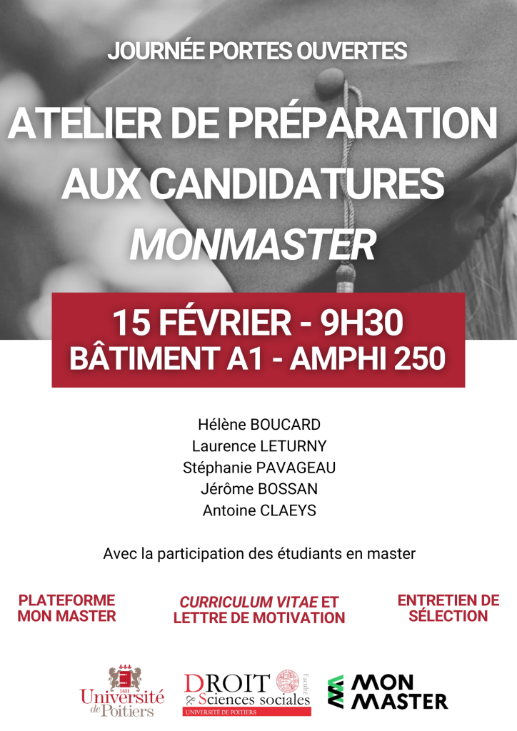 9h30. Vous souhaitez candidater à / un master en Droit à l’Université de Poitiers ? La Faculté de droit vous propose un atelier de préparation aux candidatures. Des responsables et des étudiants de master vous prodiguent des conseils et partagent leur expérience à propos de la plateforme Monmaster et de la procédure de recrutement (constitution du dossier, élaboration du curriculum vitae et rédaction de la lettre de motivation, conduite de l’entretien de sélection).