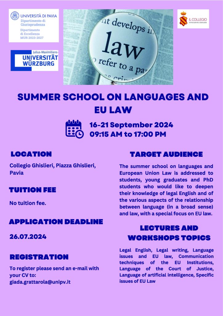 Du 16 au 21 septembre 2024, un groupe de 8 étudiants de Master et doctorants a participé à un programme de mobilité hybride (BIP) Erasmus, organisé par la Faculté de Droit de Pavie (Italie), membre de EC2U. Ce cours avait pour objectif d’offrir aux étudiants une perspective complète et variée sur la relation entre la langue et le droit, avec un accent particulier sur la dimension multilingue du droit de l’UE. La partie virtuelle du programme a eu lieu du 5 au 13 septembre.