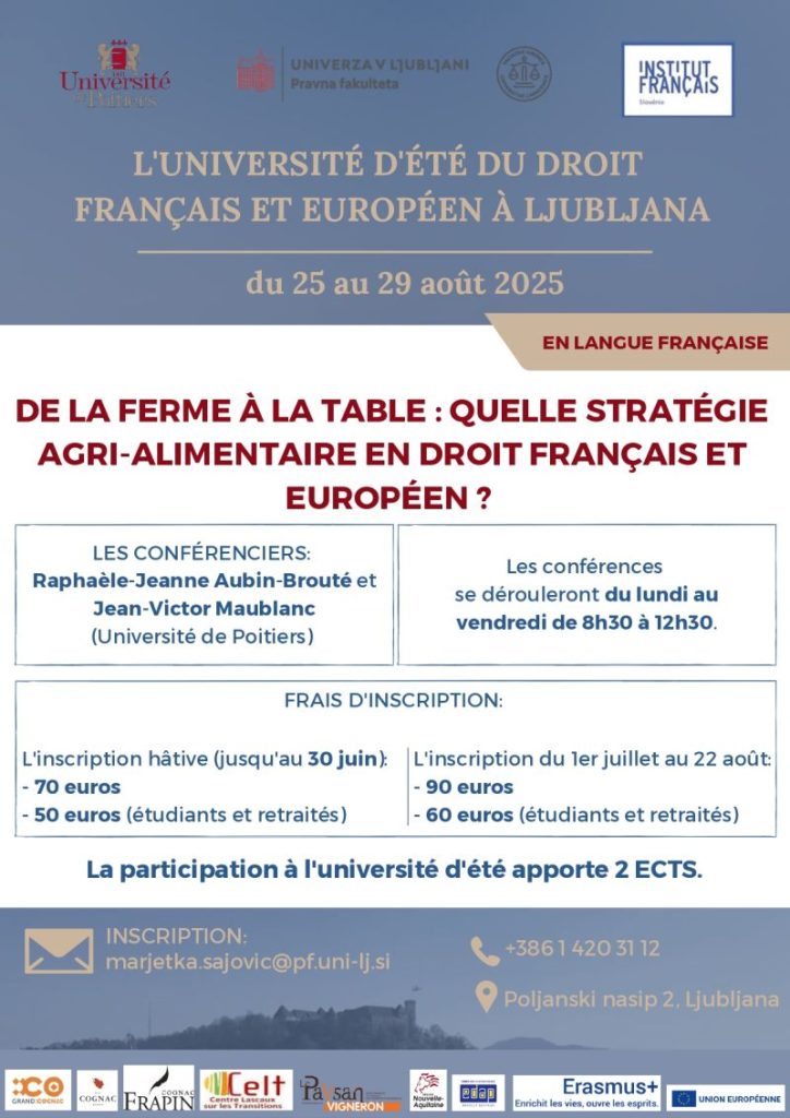 Deux enseignants chercheurs de la Faculté de Droit et Sciences sociales de l’Université de Poitiers, Jean-Victor Maublac (Maître de conférences en droit public) et Raphaele-Jeanne Aubin-Brouté (Maître de conférences en droit privé), interviennent dans le cadre d’une Université d’été auprès de l’Université de Ljubljana en Slovénie ayant comme thème la stratégie agri-alimentaire en droit français et européen.