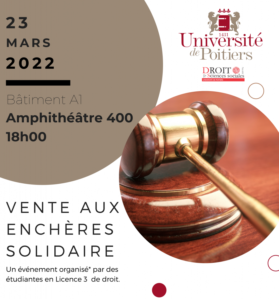 Vous êtes conviés, professeurs, chargés de TD et étudiants en droit, à la grande vente aux enchères solidaire le 23 mars 2022 en amphithéâtre 400 à 18 heures.
